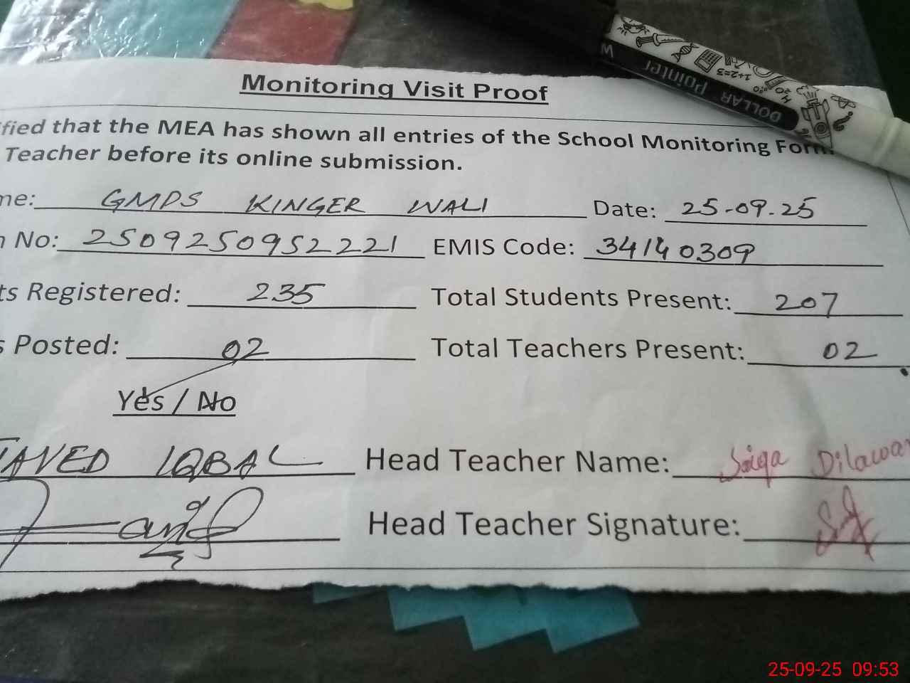 | EMIS Code: 34140309 | Name of School: GMPS KINGAR WALI | |||