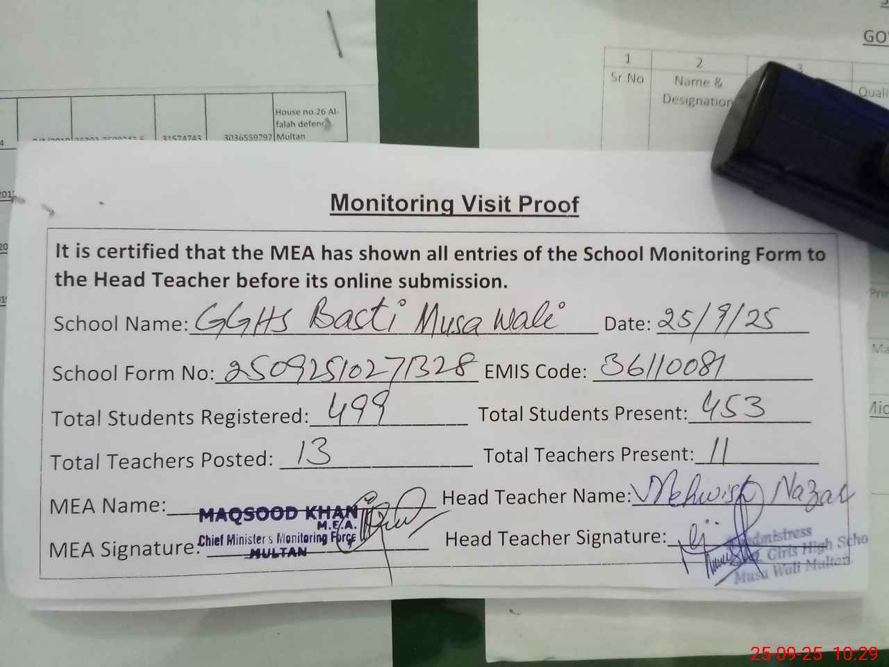 | Attendance Register | Head Teacher | MEA with School | Visit Proof |