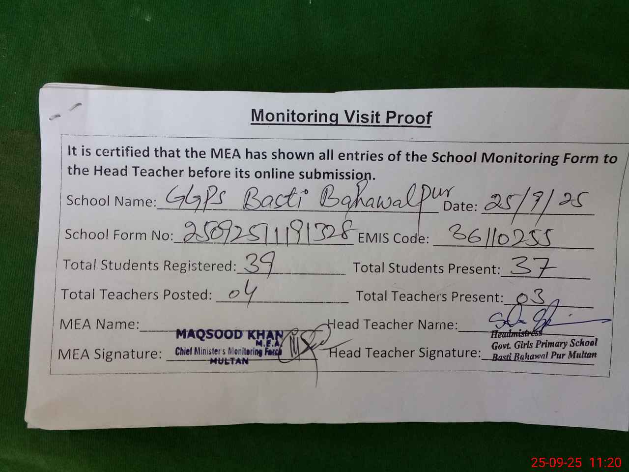 | Attendance Register | Head Teacher | MEA with School | Visit Proof |