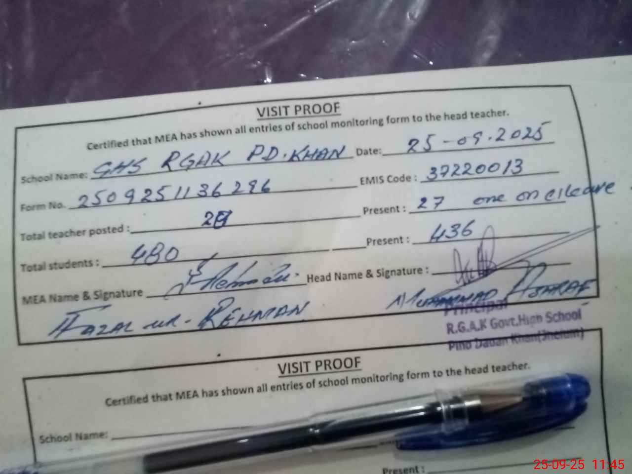 | Attendance Register | Head Teacher | MEA with School | Visit Proof |