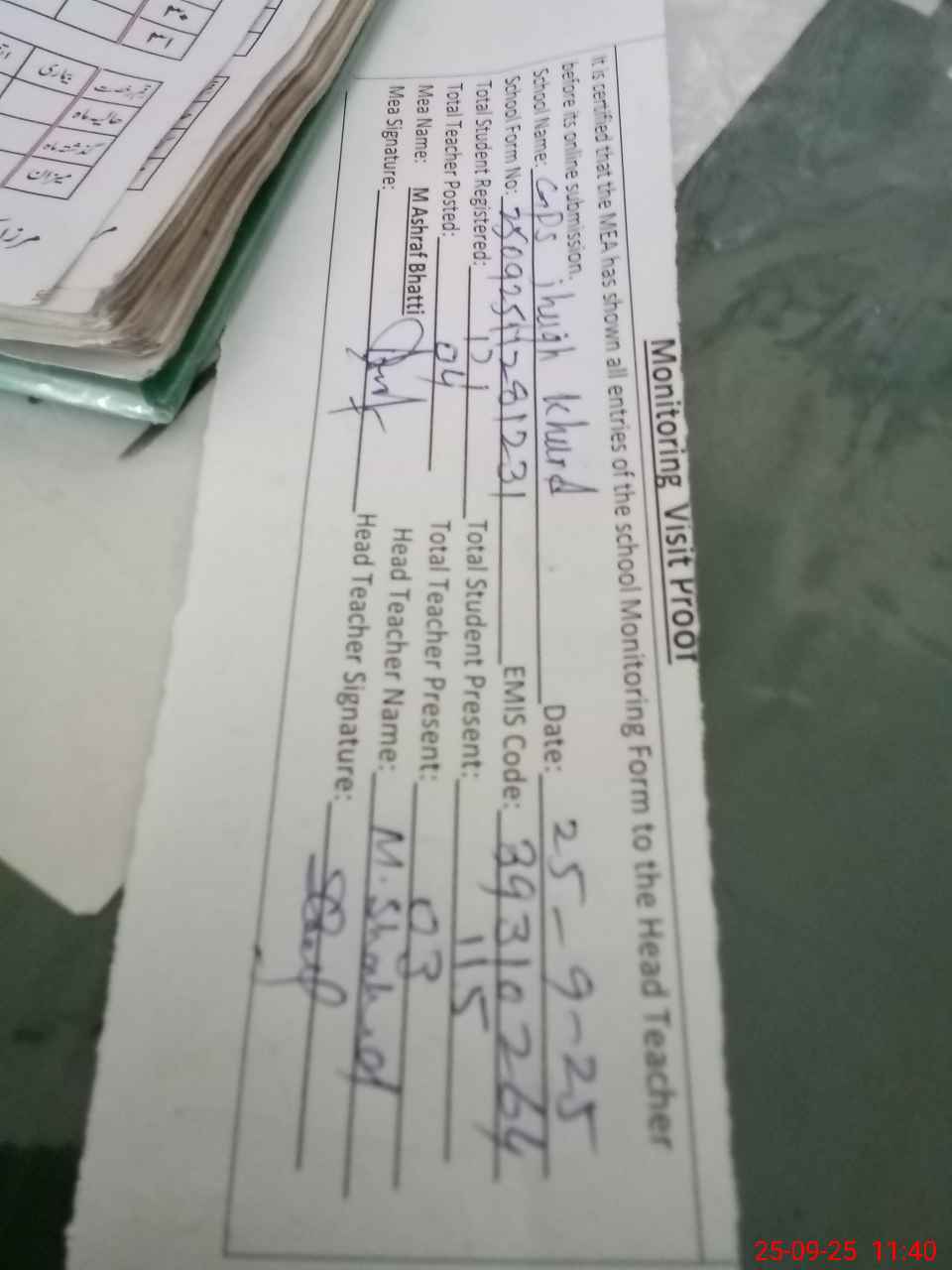 | Attendance Register | Head Teacher | MEA with School | Visit Proof |
