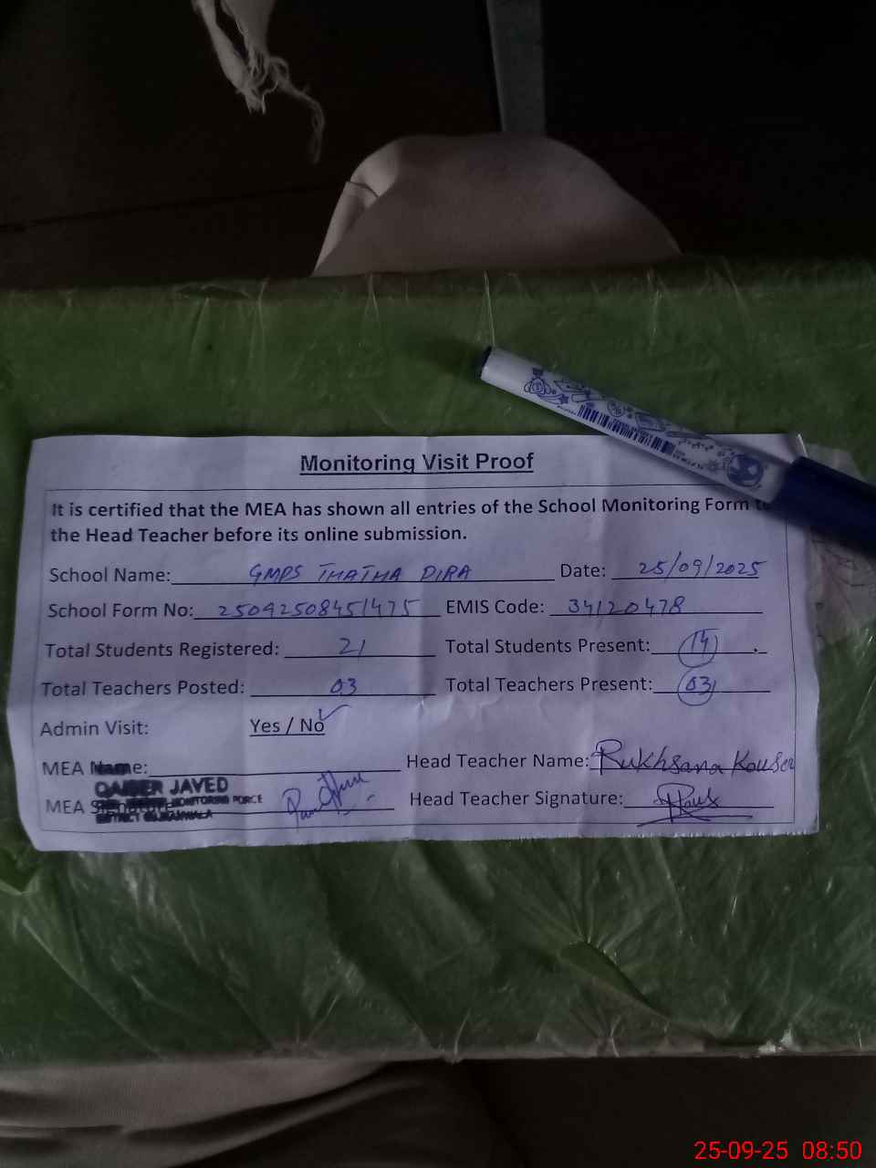 | Attendance Register | Head Teacher | MEA with School | Visit Proof |