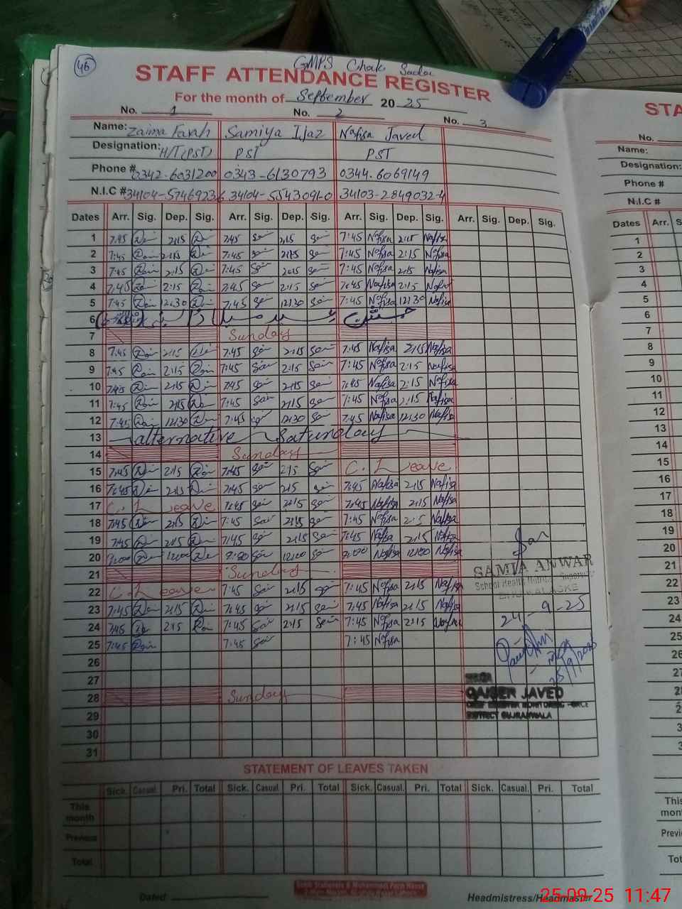 | CNIC | Full Name | Designation | R/C | Absence During Last Calender Month |