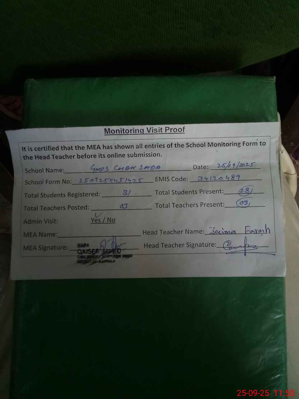 | Attendance Register | Head Teacher | MEA with School | Visit Proof |