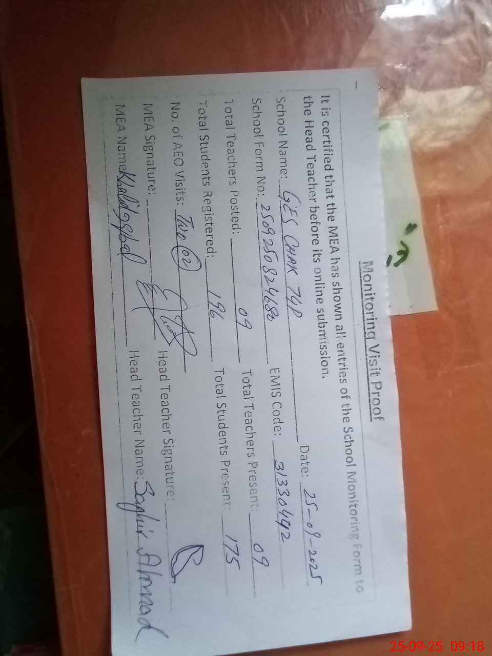 | Attendance Register | Head Teacher | MEA with School | Visit Proof |