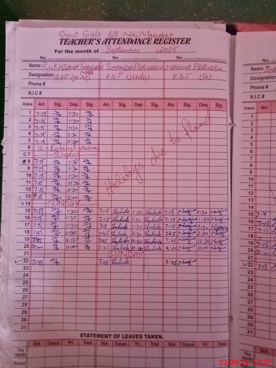 | CNIC | Full Name | Designation | R/C | Absence During Last Calender Month |