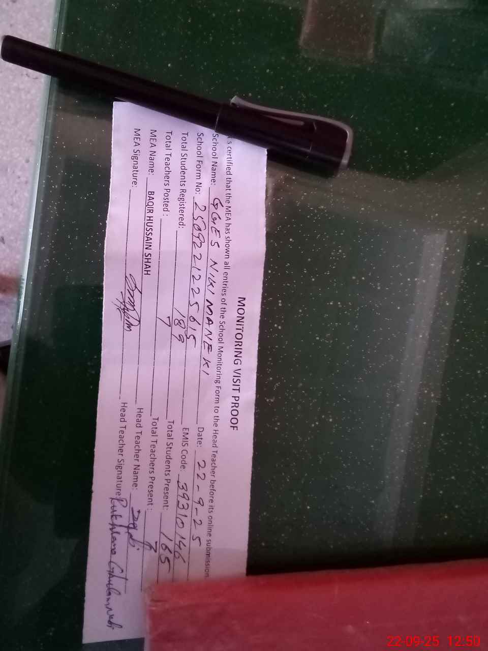 | Attendance Register | Head Teacher | MEA with School | Visit Proof |