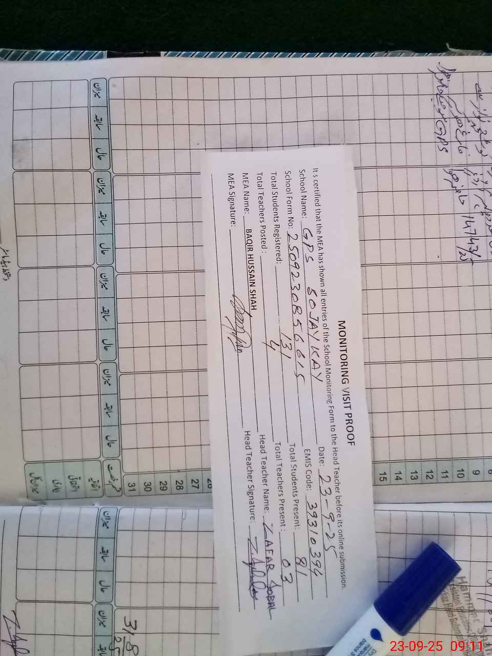 | Attendance Register | Head Teacher | MEA with School | Visit Proof |