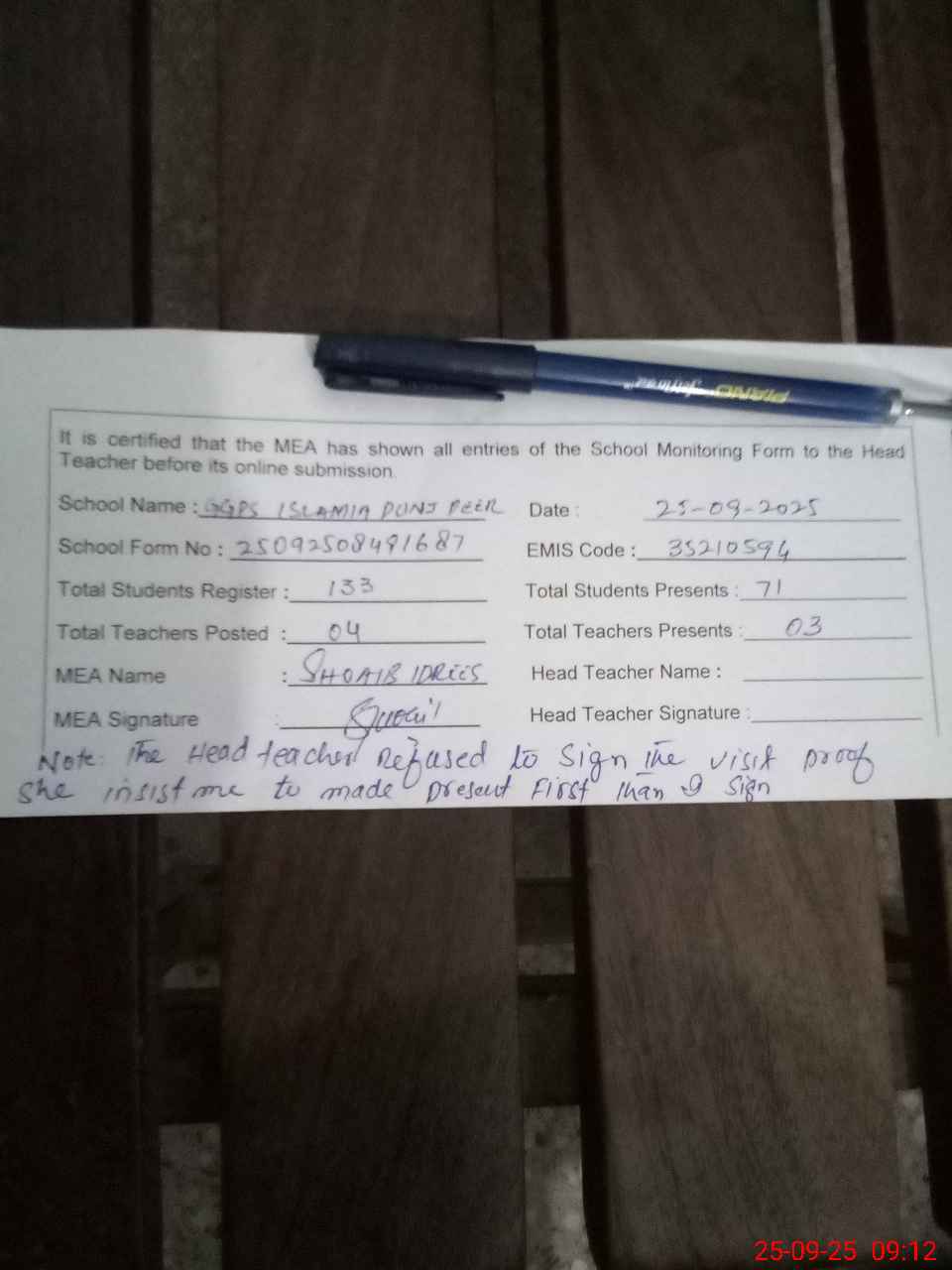 | Attendance Register | Head Teacher | MEA with School | Visit Proof |