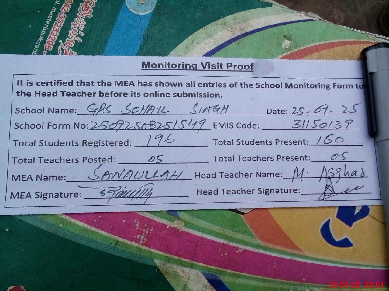| Attendance Register | Head Teacher | MEA with School | Visit Proof |