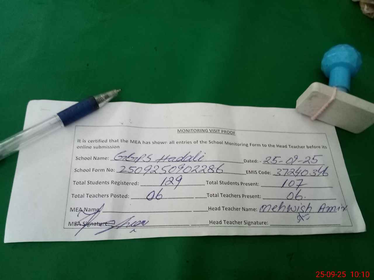| Attendance Register | Head Teacher | MEA with School | Visit Proof |