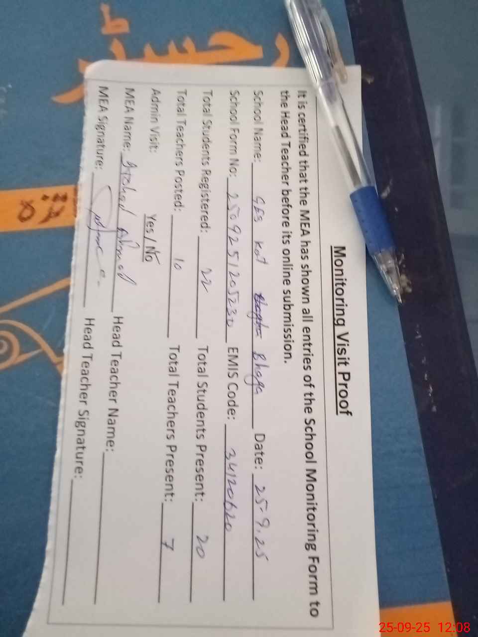 | Attendance Register | Head Teacher | MEA with School | Visit Proof |