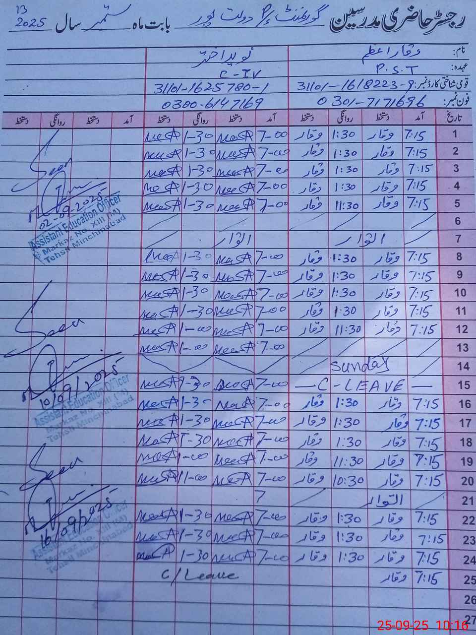| CNIC | Full Name | Designation | R/C | Absence during last cal. month |