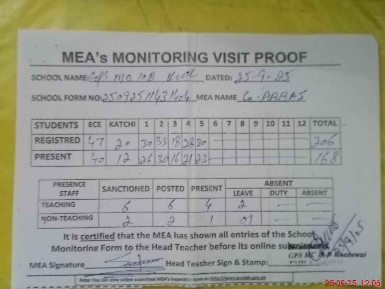 | Attendance Register | Head Teacher | MEA with School | Visit Proof |