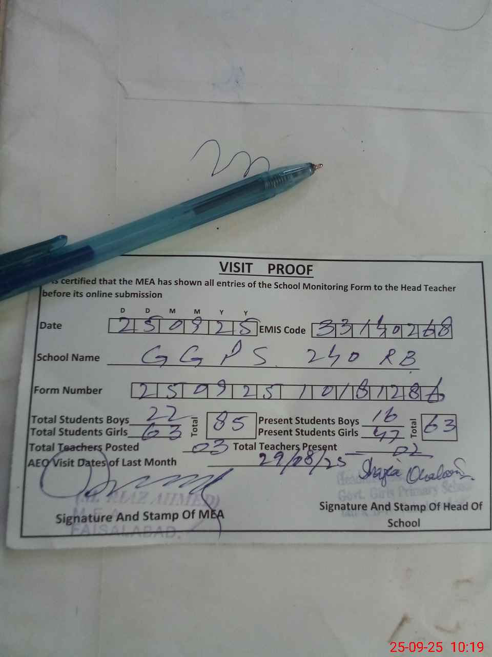 | Attendance Register | Head Teacher | MEA with School | Visit Proof |