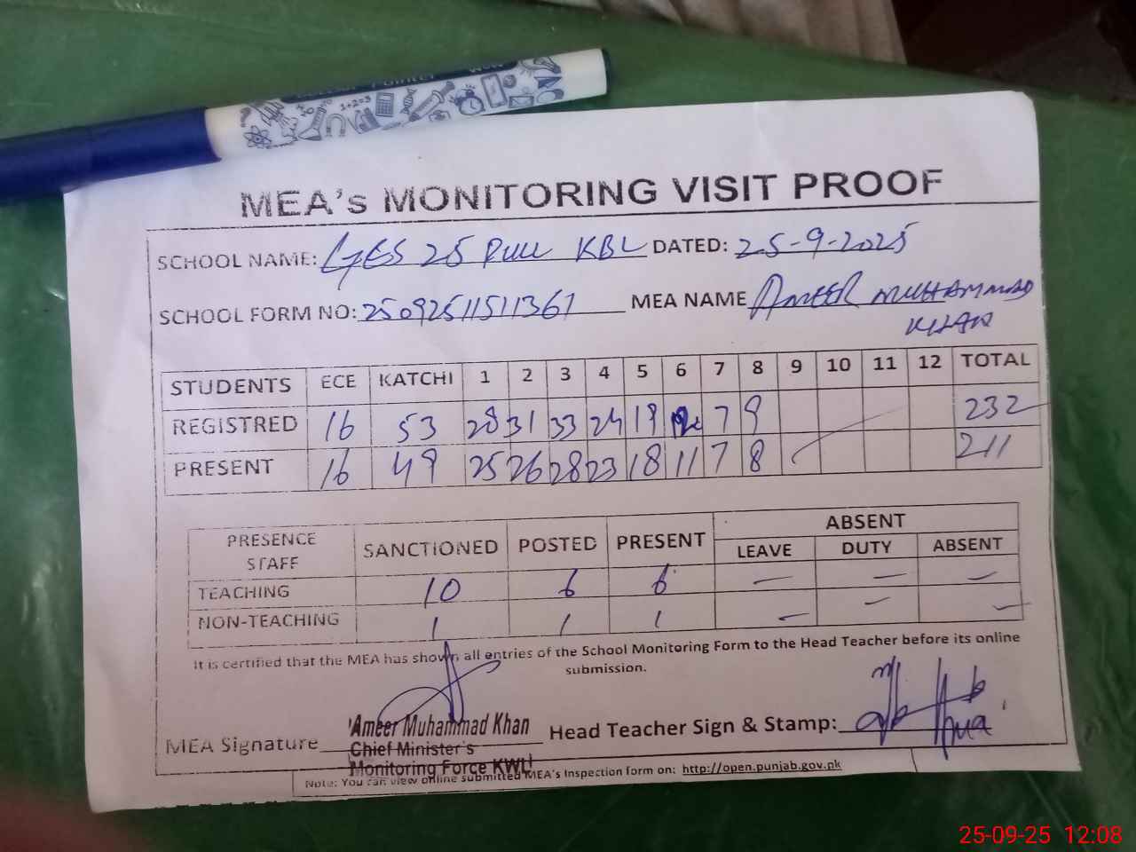 | Attendance Register | Head Teacher | MEA with School | Visit Proof |