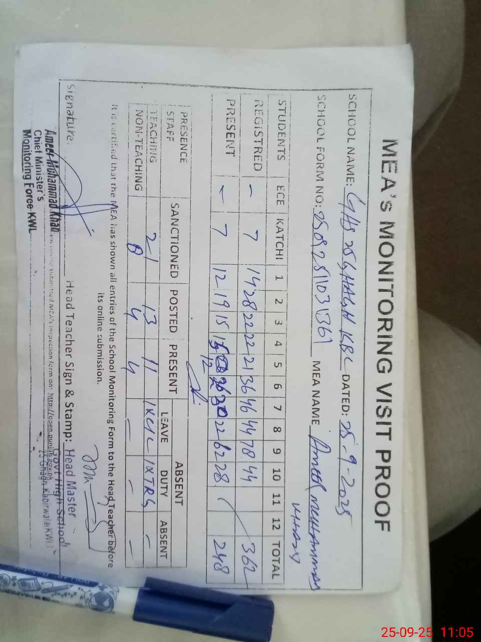 | Attendance Register | Head Teacher | MEA with School | Visit Proof |
