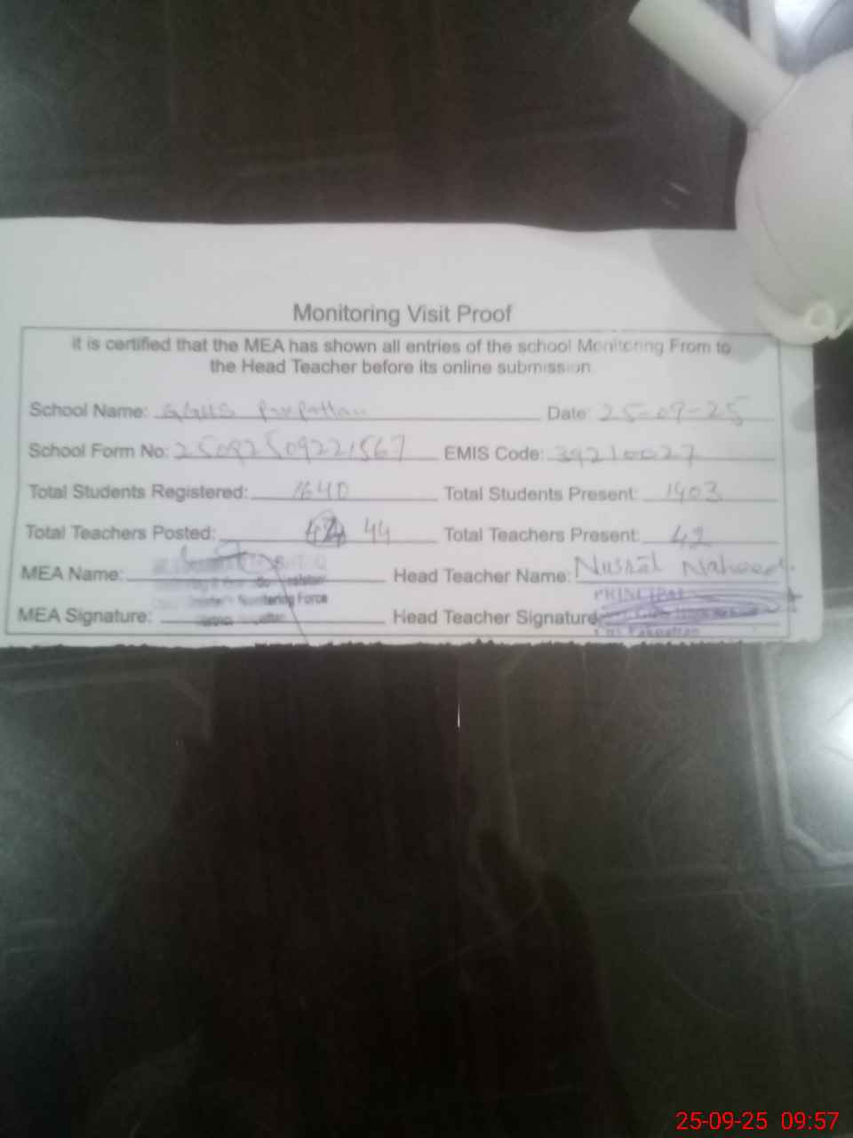 | Attendance Register | Head Teacher | MEA with School | Visit Proof |
