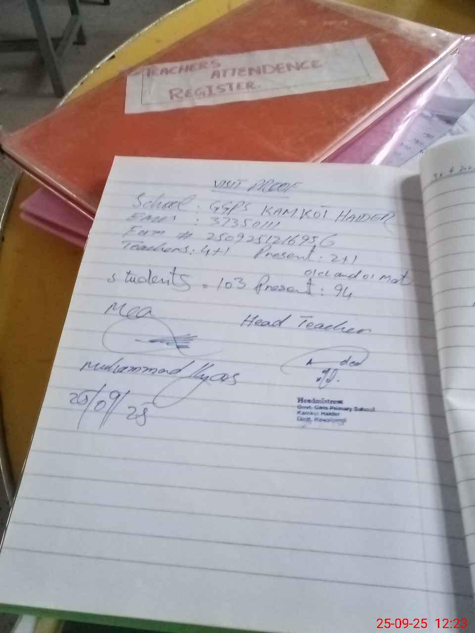 | Attendance Register | Head Teacher | MEA with School | Visit Proof |