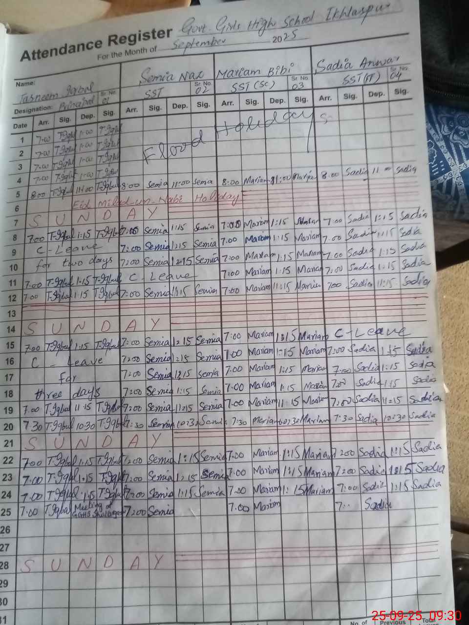 | Monitoring Date: 25-09-2025 | Start Time: 25-09-2025 08:19 AM | End Time: 25-09-2025 09:47 AM | Name of MEA: SA**** UL**** KH**** | |