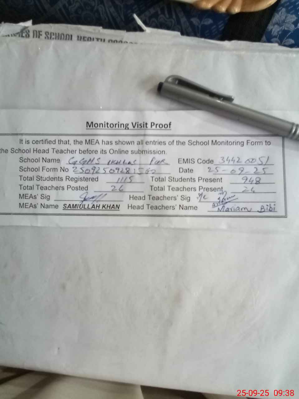 | Attendance Register | Head Teacher | MEA with School | Visit Proof |