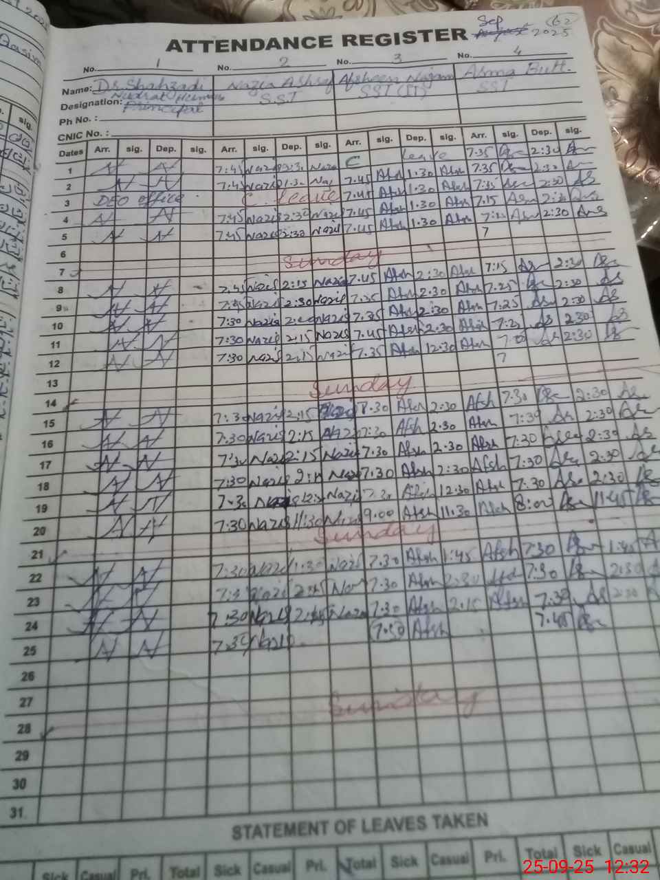 | CNIC | Full Name | Designation | R/C | Absence during last cal. month |