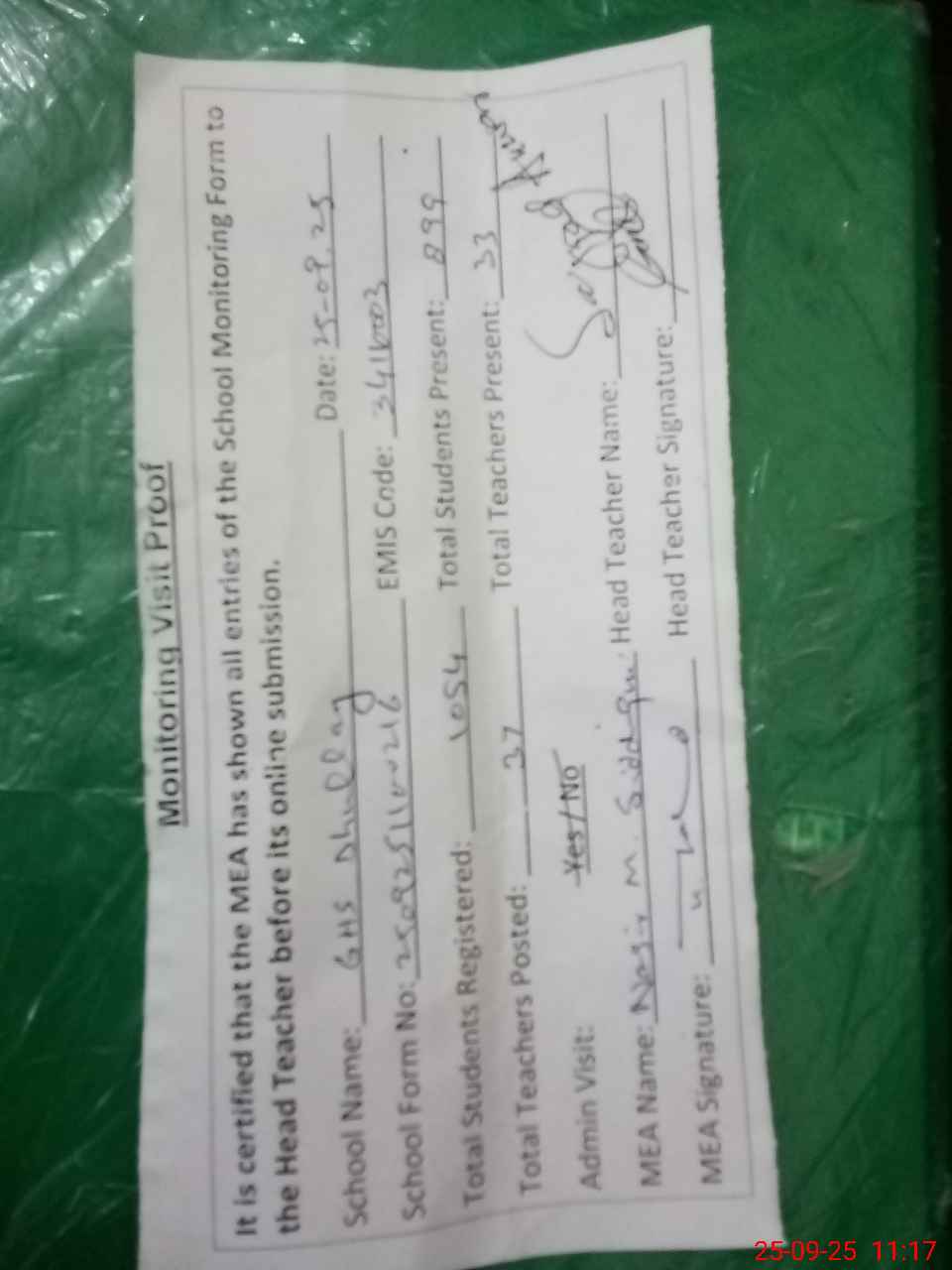| Attendance Register | Head Teacher | MEA with School | Visit Proof |
