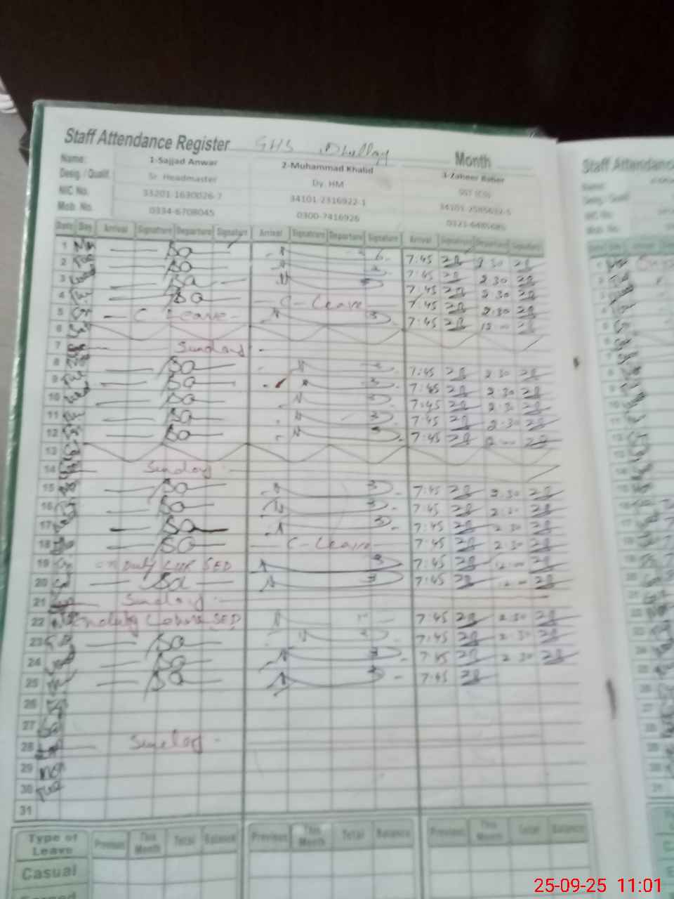 | CNIC | Full Name | Designation | R/C | Absence during last cal. month |