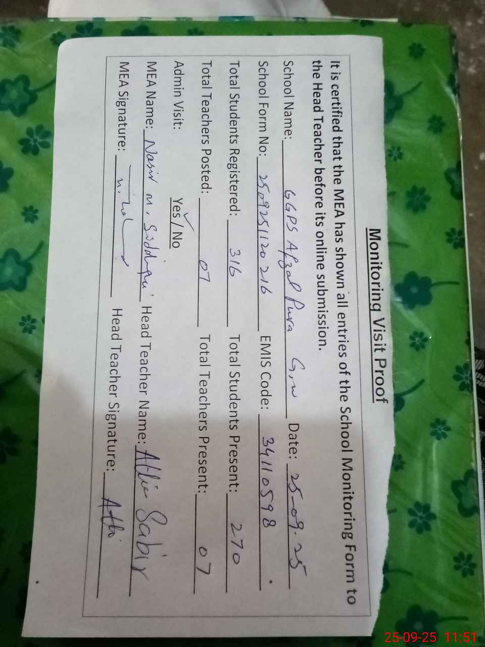 | EMIS Code: 34110598 | Name of School: GGPS AFZAL PURA DHULLAY | |||