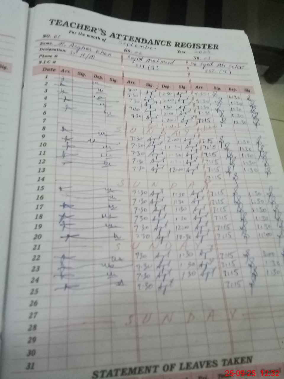 | CNIC | Full Name | Designation | R/C | Absence During Last Calender Month |