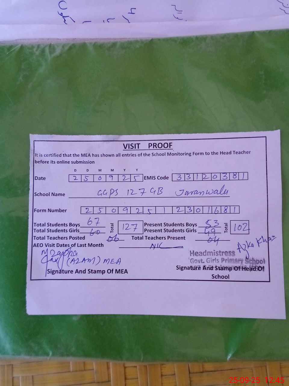 | EMIS Code: 33120381 | Name of School: GGPS CHAK 127 GB I JARANWALA | |||