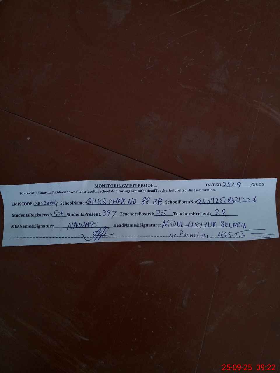 | Monitoring Date: 25-09-2025 | Start Time: 25-09-2025 08:42 AM | End Time: 25-09-2025 09:24 AM | Name of MEA: MU**** NA**** | |