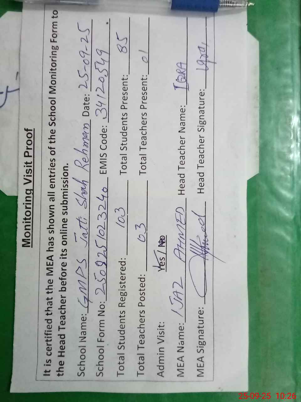 | Attendance Register | Head Teacher | MEA with School | Visit Proof |