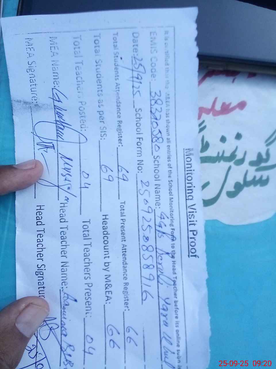 | Attendance Register | Head Teacher | MEA with School | Visit Proof |