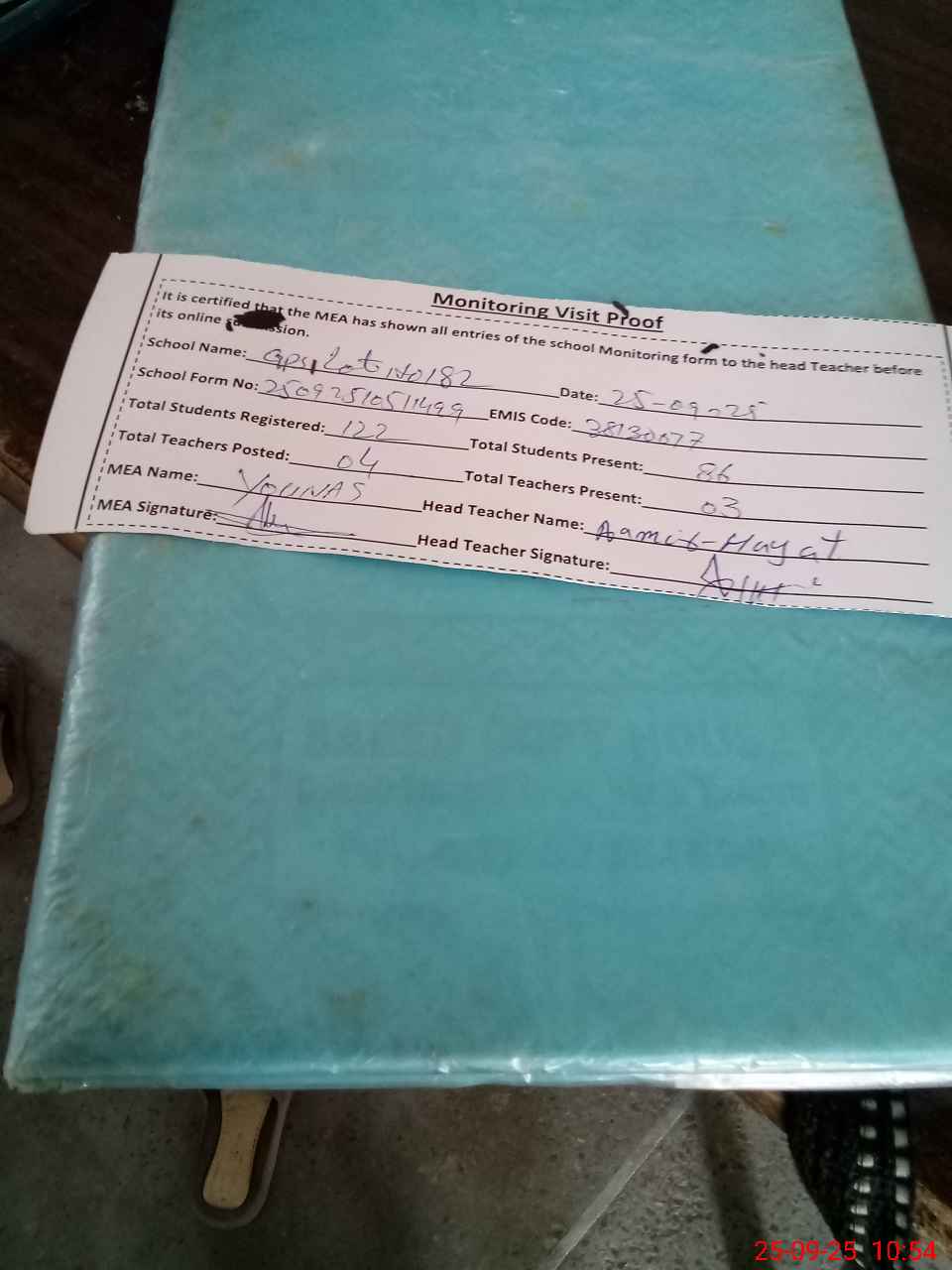 | Attendance Register | Head Teacher | MEA with School | Visit Proof |