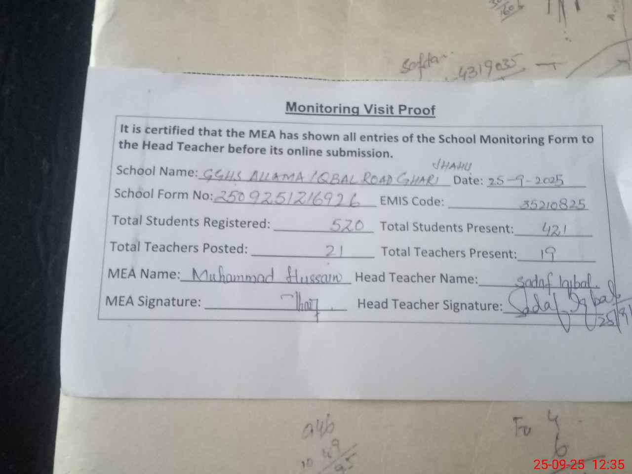 | EMIS Code: 35210825 | Name of School: GGHS ALLAMA IQBAL ROAD GHARI SHAHU (EX-MCL) | |||