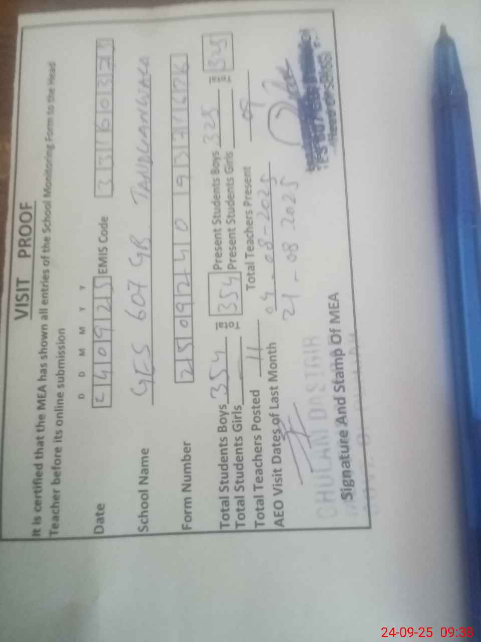 | Certified that this School was Inspected by the Undersigned MEA/DMO Today and the Information Stated Above is as Per Record. | |||||