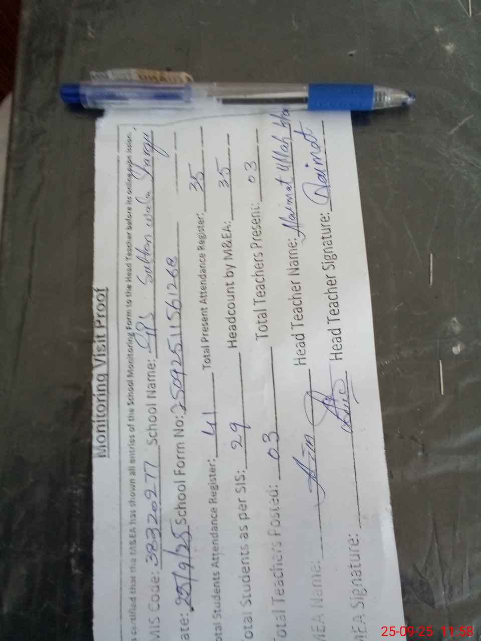 | Attendance Register | Head Teacher | MEA with School | Visit Proof |