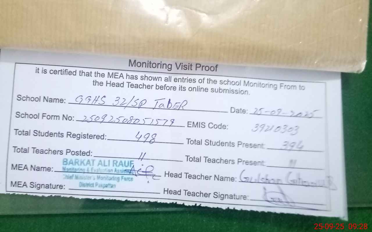 | EMIS Code: 39210303 | Name of School: GGHS CHAK NO.32 SP TABAR | |||