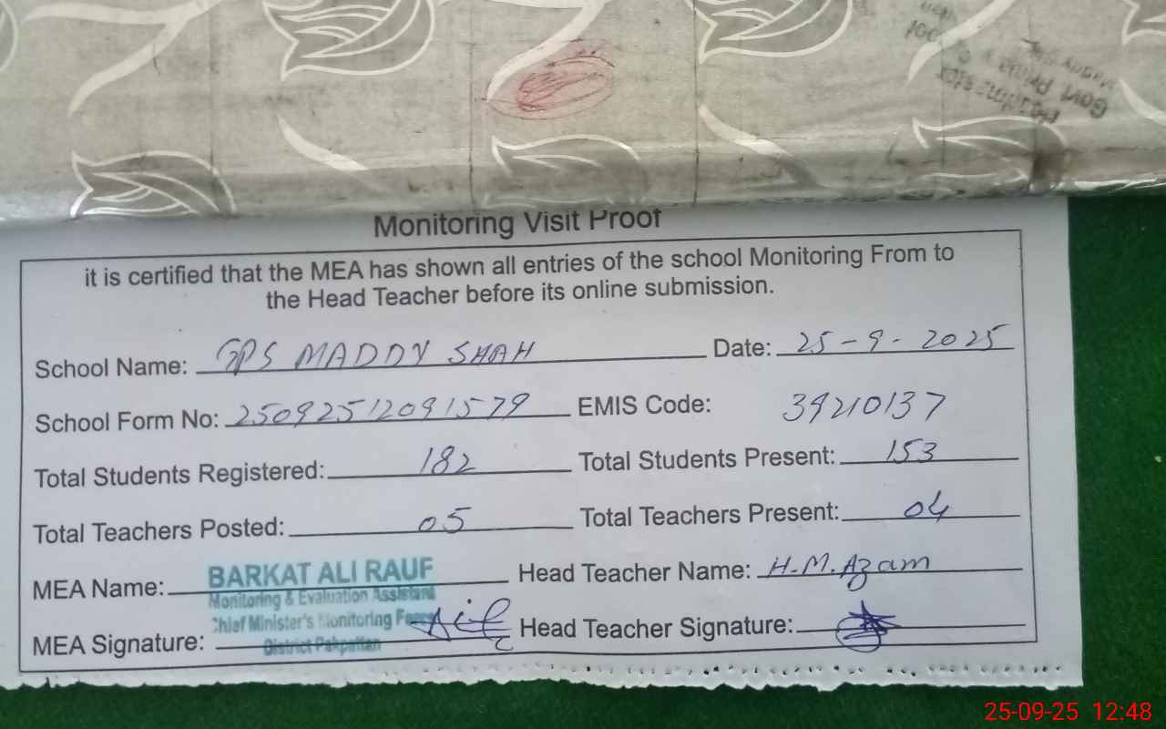 | EMIS Code: 39210137 | Name of School: GPS MADAY SHAH | |||