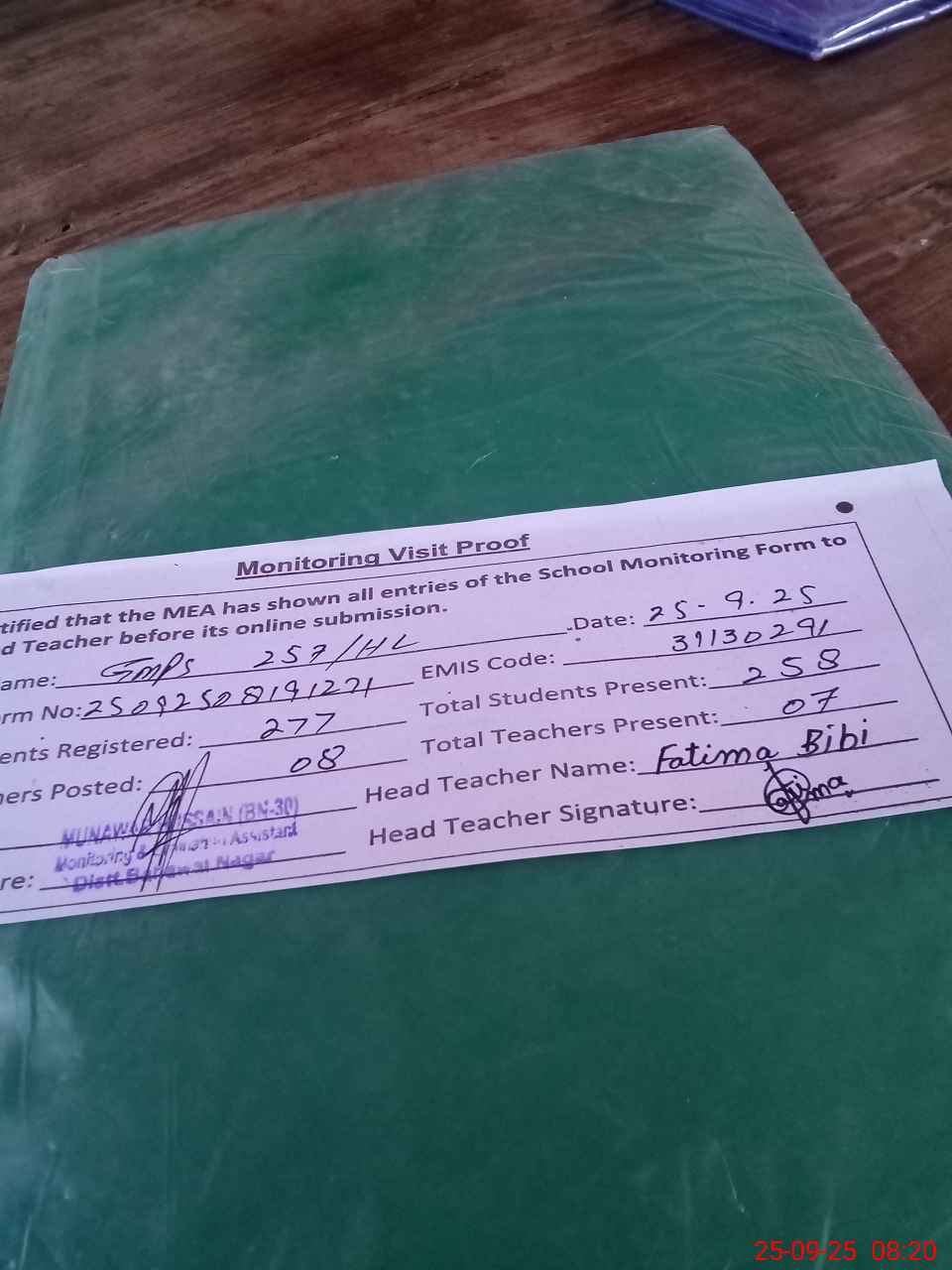 | Attendance Register | Head Teacher | MEA with School | Visit Proof |