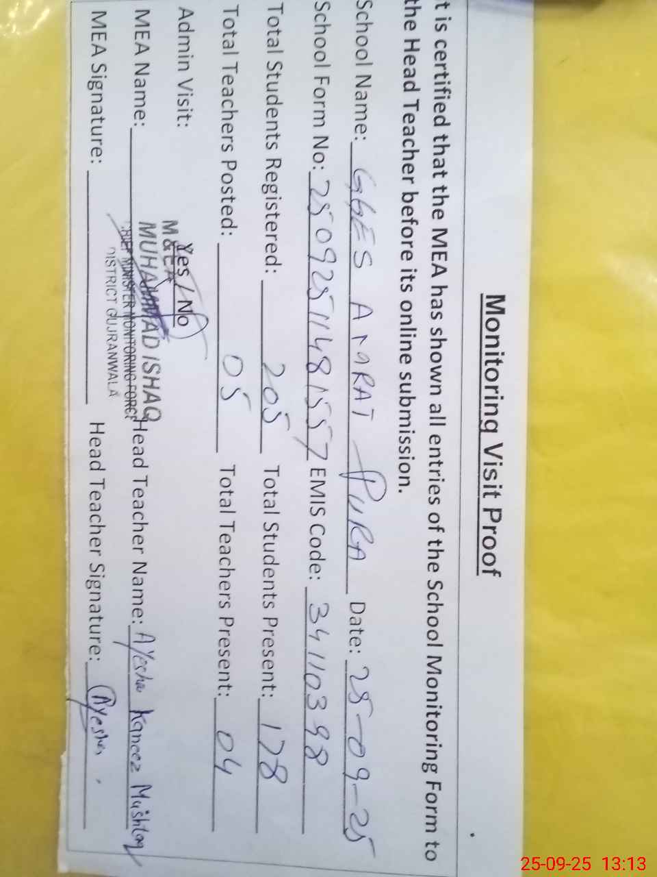 | Attendance Register | Head Teacher | MEA with School | Visit Proof |