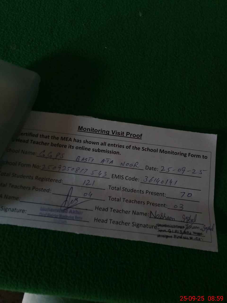 | Attendance Register | Head Teacher | MEA with School | Visit Proof |