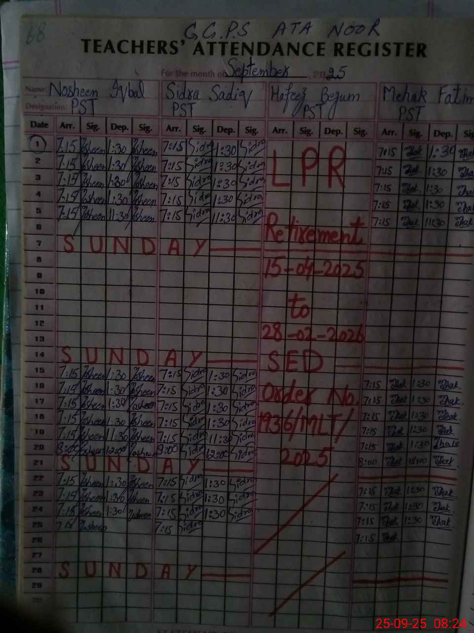 | CNIC | Full Name | Designation | R/C | Absence During Last Calender Month |