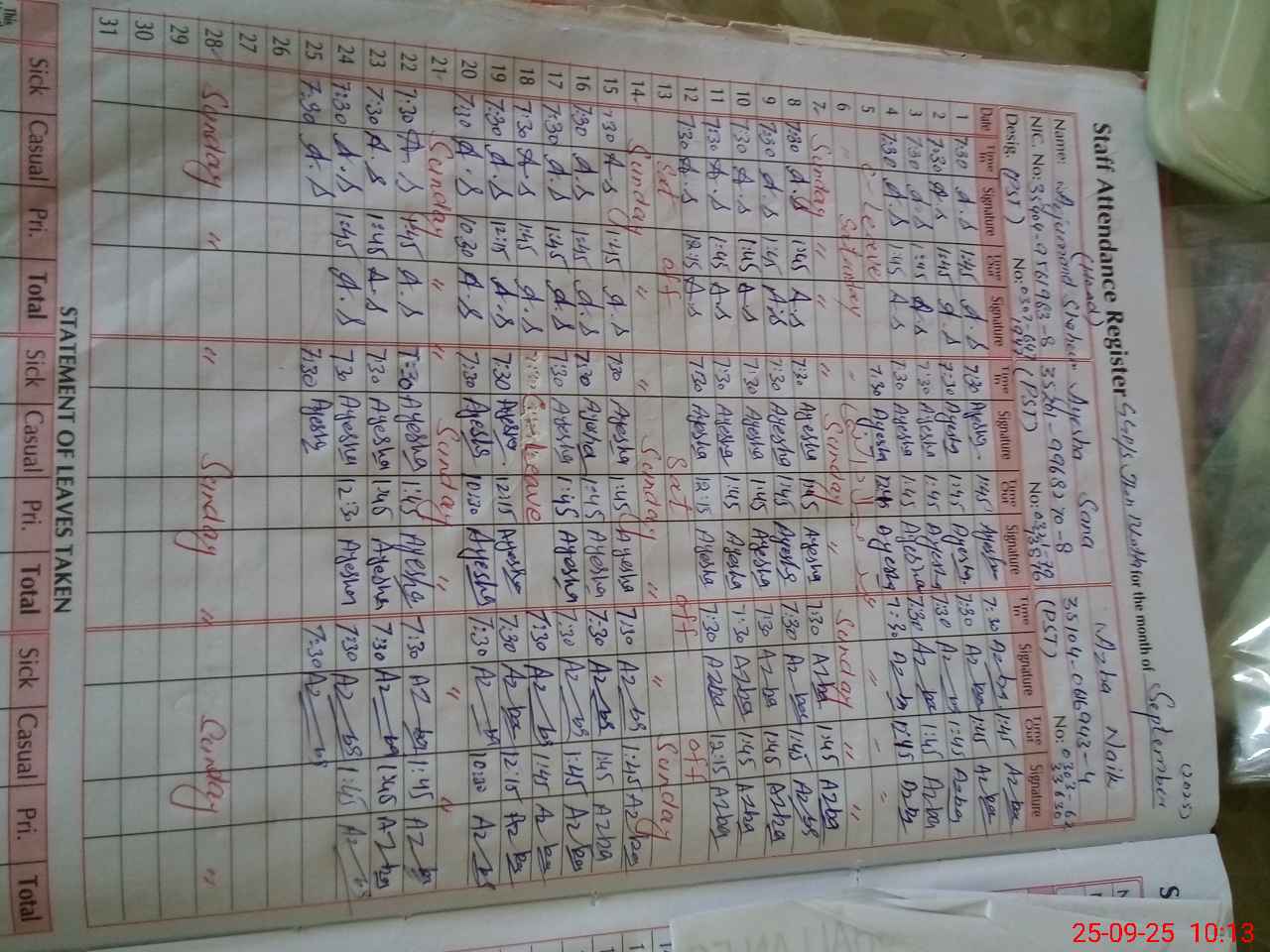 | CNIC | Full Name | Designation | R/C | Absence During Last Calender Month |