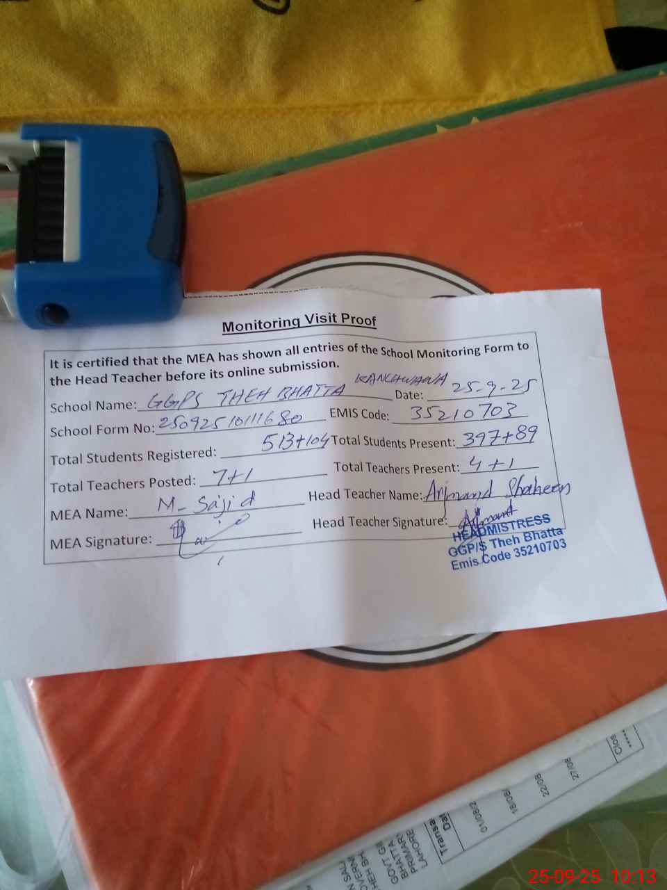 | Attendance Register | Head Teacher | MEA with School | Visit Proof |