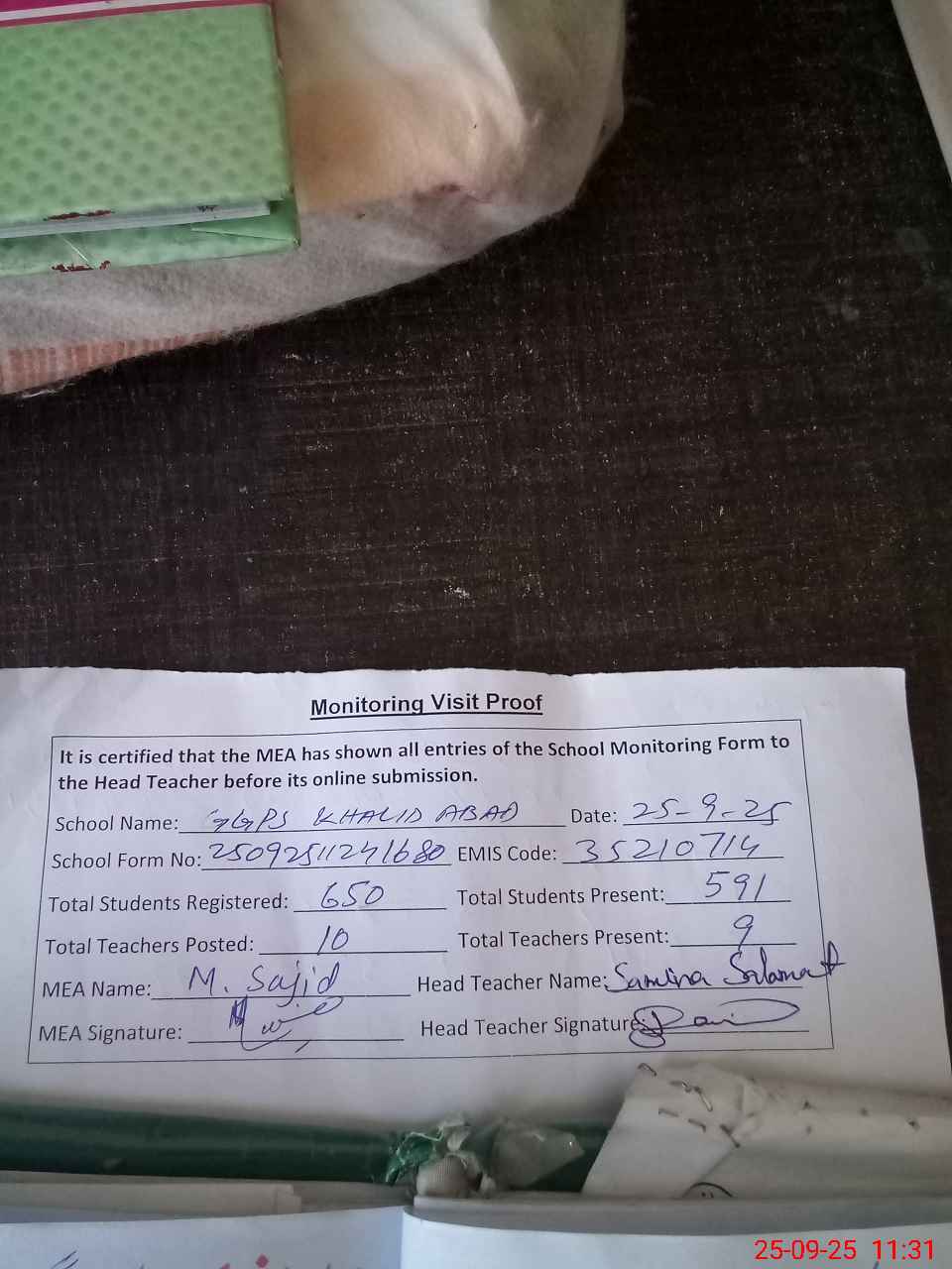 | Attendance Register | Head Teacher | MEA with School | Visit Proof |