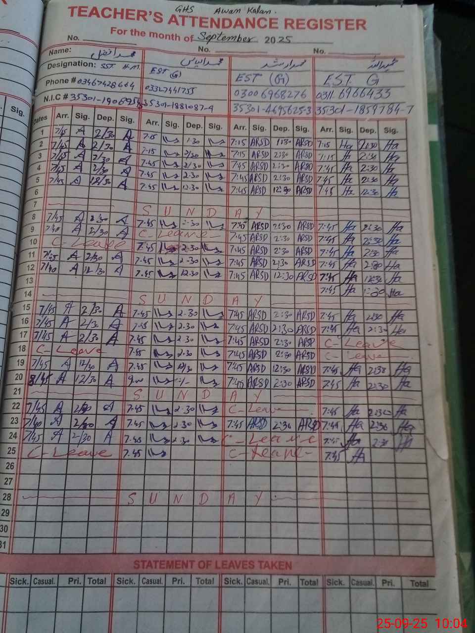 | CNIC | Full Name | Designation | R/C | Absence During Last Calender Month |