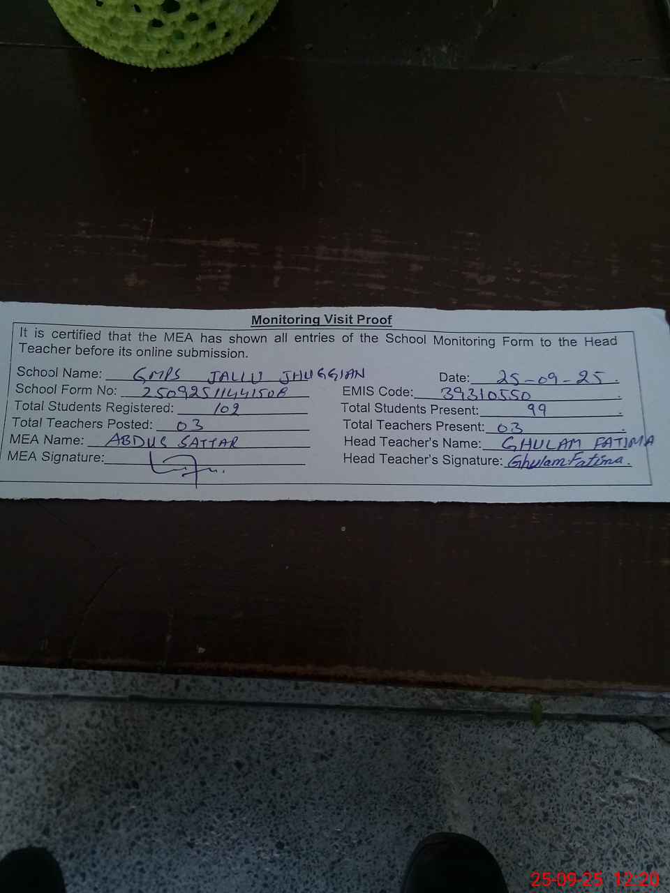 | Attendance Register | Head Teacher | MEA with School | Visit Proof |