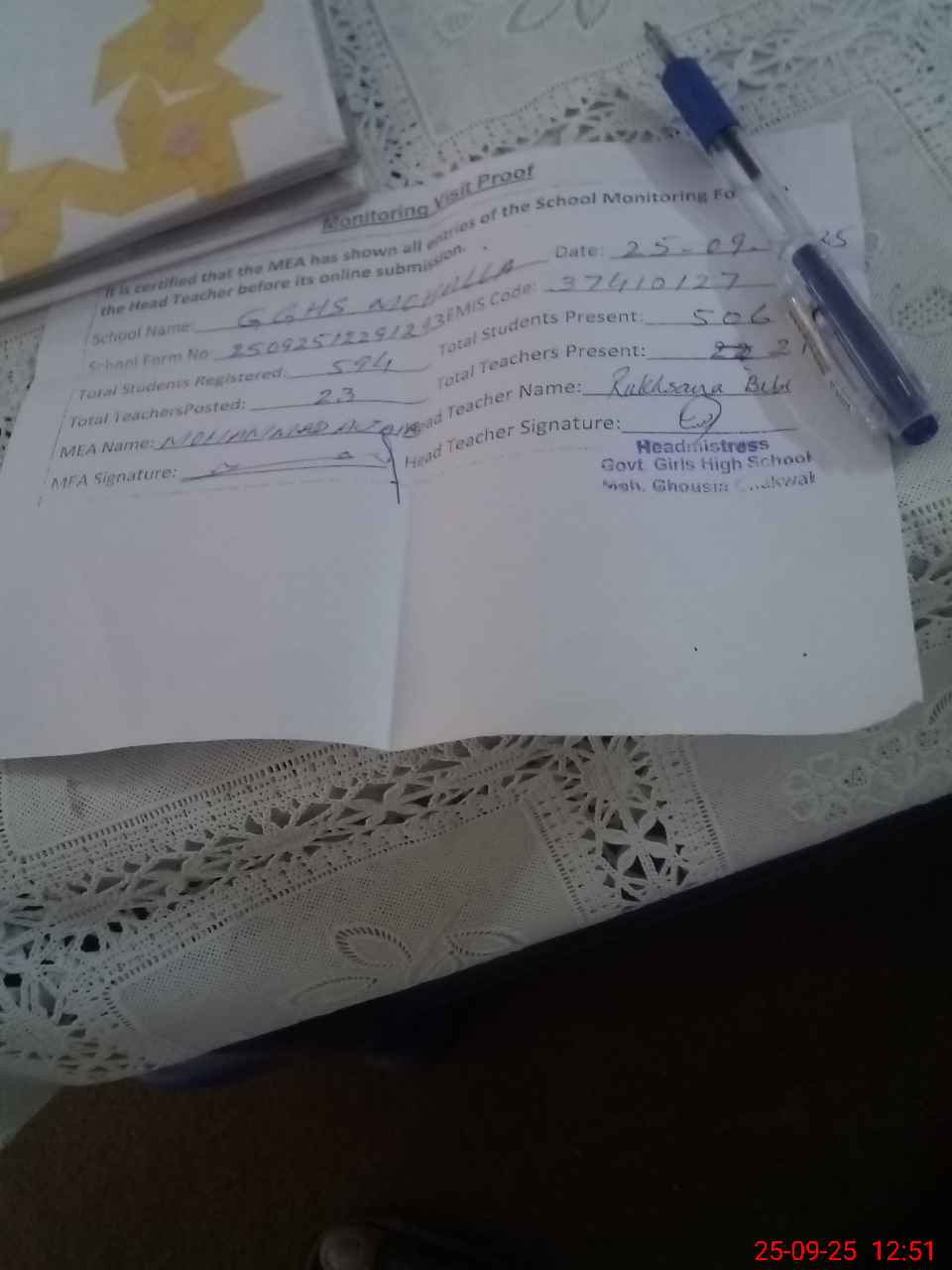 | Certified that this School was Inspected by the Undersigned MEA/DMO Today and the Information Stated Above is as Per Record. | |||||